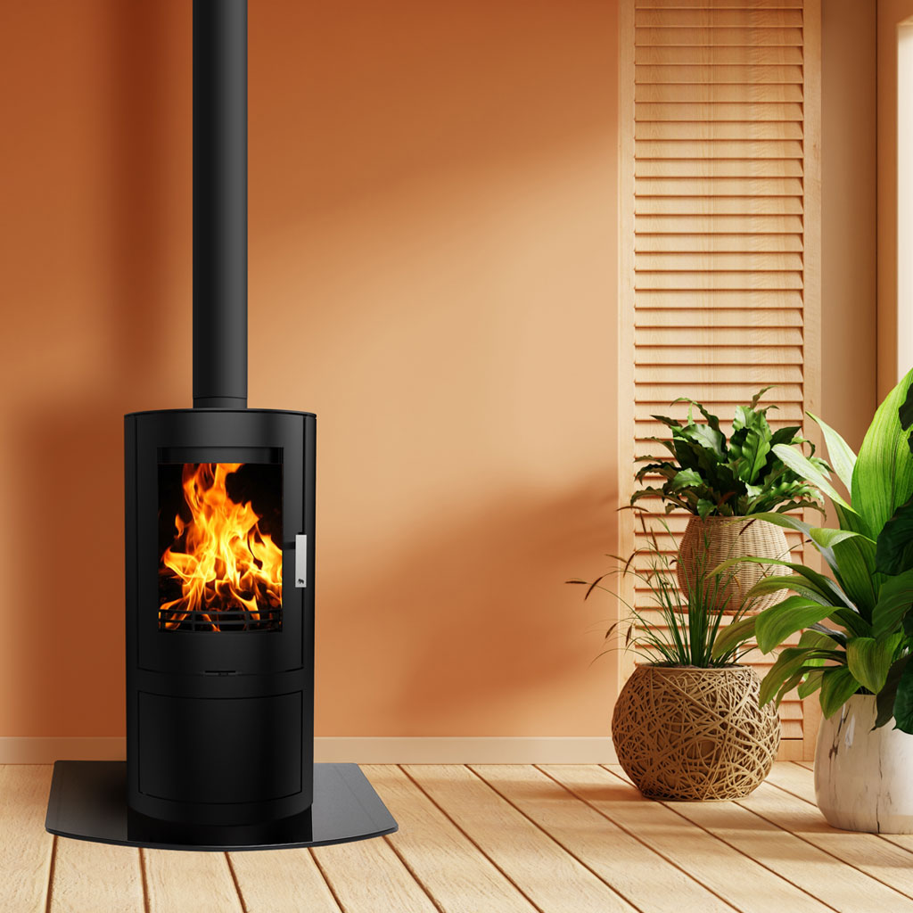 Crafted from durable high-grade steel, the tall, cylindrical body features a large panoramic glass door, allowing you to enjoy the full beauty of real wood flames. Designed for both performance and ease of installation, the Woolly Mammoth 5c is Cool Hearth Rated, meaning it can be installed on a 12mm decorative hearth such as slate, granite, or toughened glass — without the need for a traditional constructional base.